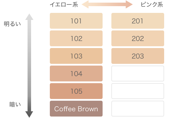 ※ファンデーションの種類によって、ご用意している色味は異なります。- ※カラーチャートの色味は、見本ですので商品と全く同じではありません。