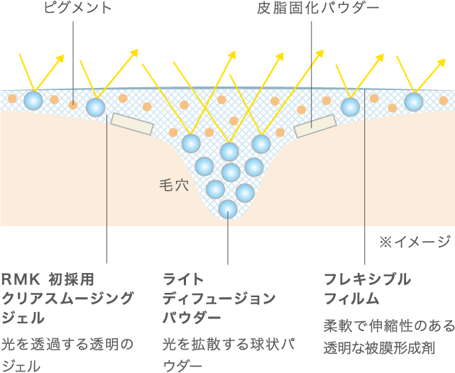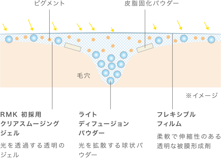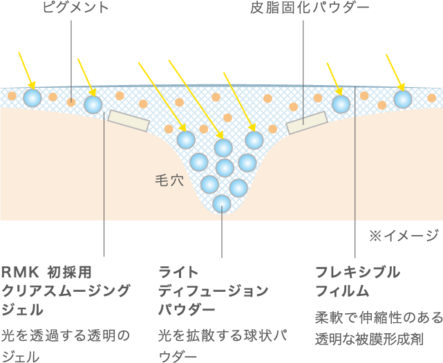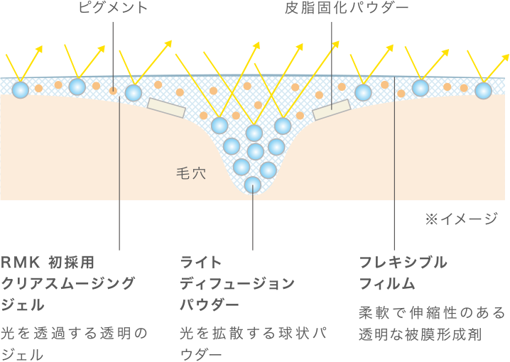 RMK初採用のクリアスムージングジェルが毛穴などの凹凸をスムースにととのえ、ライトディフュージョンパウダーが光を拡散。すりガラスのように内側から放たれるやわらかな光でぼかします。それにより、ファンデーションの厚みやカバー粉体に頼ることなく、ひと塗りで肌のトーンを均一にととのえ、素肌の息づかいを感じさせる自然な仕上がりに。