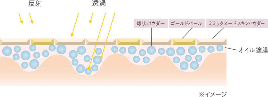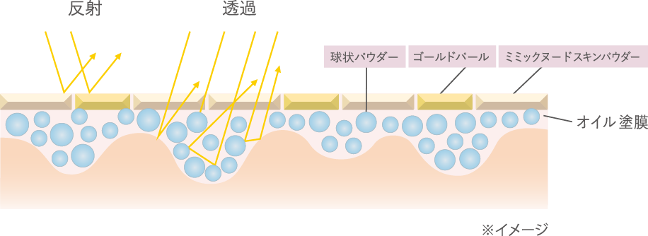 オイルが肌とファンデーションを引き合わせて密着させ一体化。
