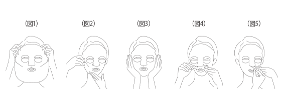 ※鼻の下の点線に沿ってマスクを切りはなし、内側に引っぱり、小鼻やほうれい線になじませることで、フィット感が高まります。(図4・図5)